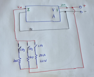 Para testar diferentes situações de carga, utilizaremos três resistores de 10 Ω / 10 W, cada um acionado por uma microchave, permitindo combinar as cargas conforme desejado.