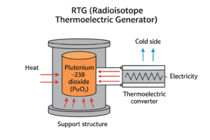• Funciona no espaço profundo, onde não há luz solar suficiente para painéis solares.
